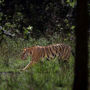 Kanha National Park unfolds like a living painting, vast sal forests give way to open meadows, mist drifts through forest corridors, and the jungle breathes at an unhurried pace. Each safari feels expansive and cinematic, with long drives through grasslands where herds of deer gather and predators move with quiet confidence. Kanha is celebrated for its successful conservation story, most notably the revival of the hard-ground barasingha, often seen grazing in open clearings. Tigers here reveal themselves subtly resting in shade, crossing trails, or emerging at dawn, while leopards, wild dogs, gaur, and rich birdlife add to the drama. Light changes constantly, shaping mood and movement, making every drive feel different from the last. Guided by skilled naturalists, a Kanha safari is not just about sightings, but about understanding space, behavior, and the timeless rhythm of one of India’s most beautifully balanced forests.